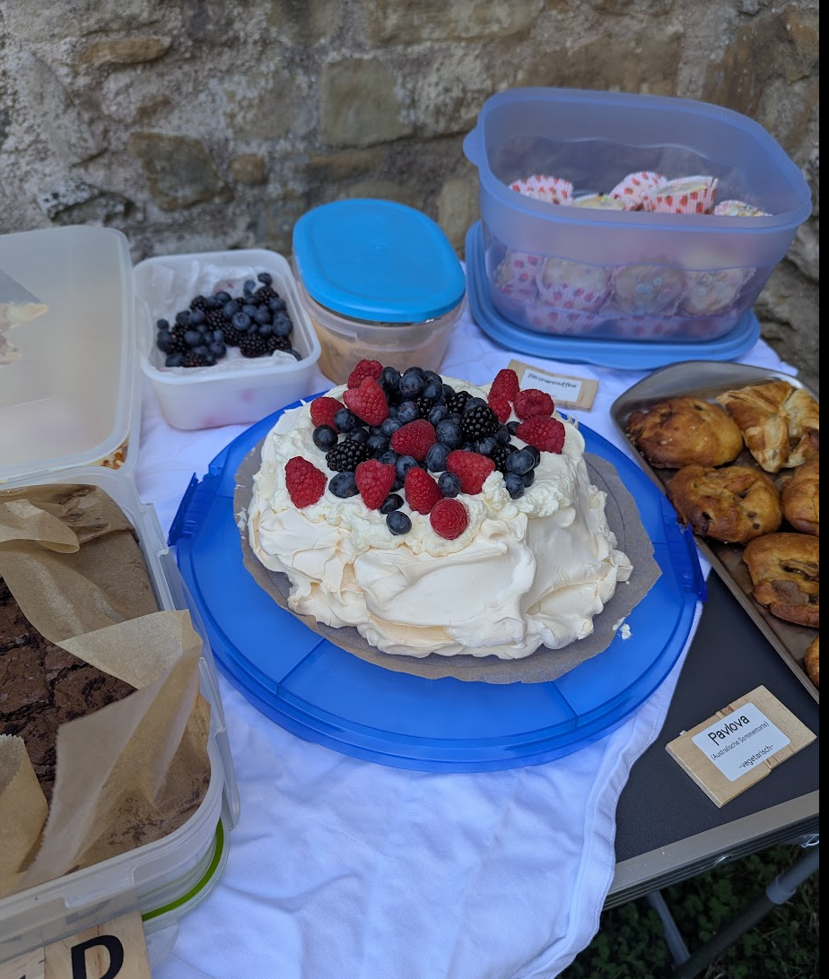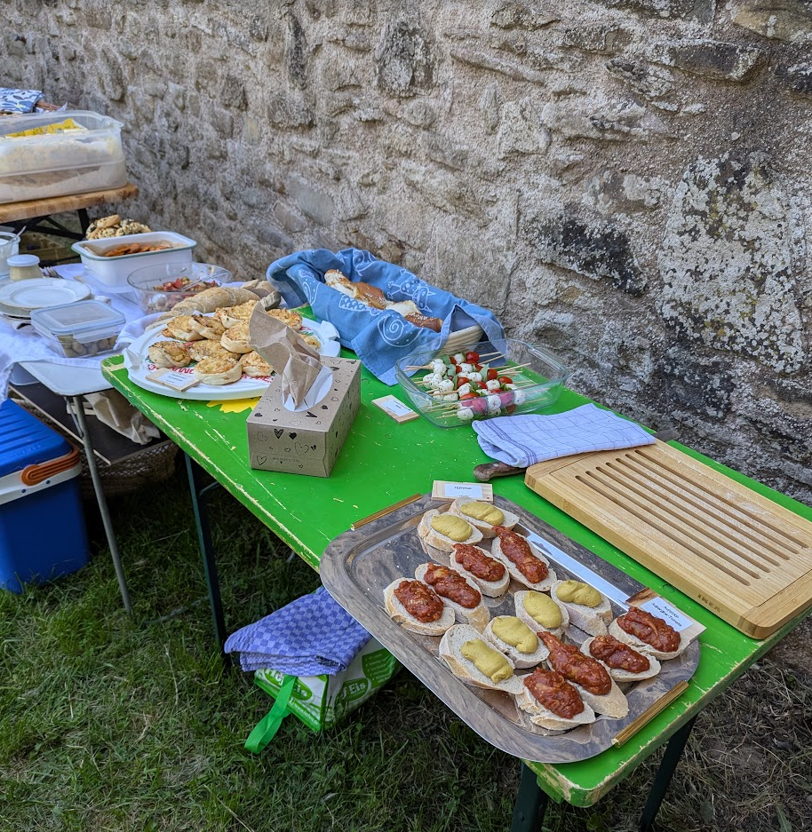 Das große, bunte Buffet mit mitgebrachten Speisen ließ keine Wünsche offen – von herzhaft bis süß war für jeden Geschmack etwas dabei. Dazu gab es erfrischende Getränke vom Bioladen Ursprung, die perfekt zum sommerlichen Flair passten. Dank des Spendenkässchens konnten die Kosten gemeinschaftlich getragen werden – ganz im Sinne unseres solidarischen Miteinanders.